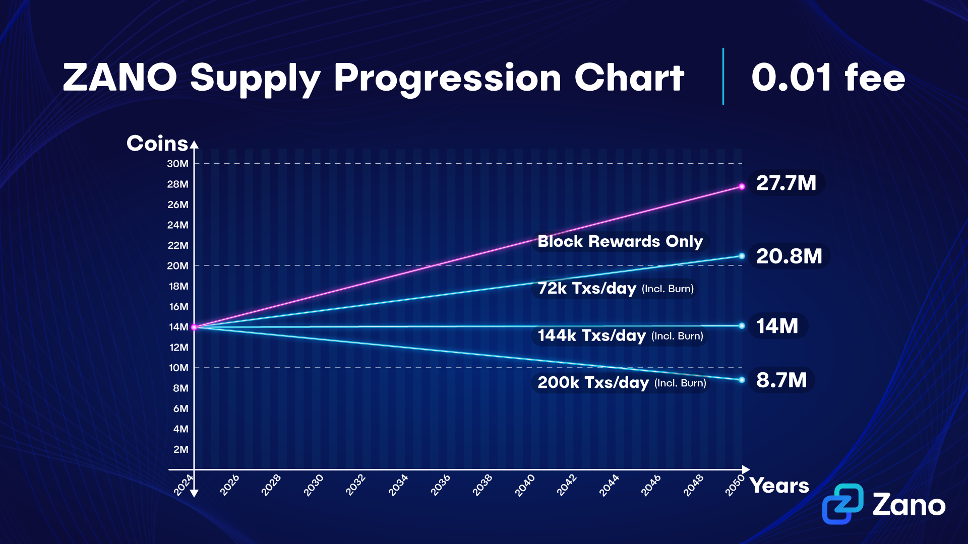 On Zano, all network fees are being burned, meaning that with enough network usage, the daily fee burning could surpass the emission from block rewards, resulting in supply becoming deflationary over time.
