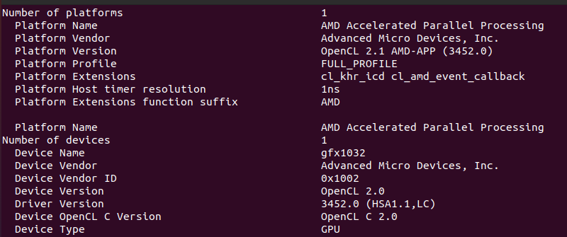 sudo clinfoYou should see something like the following, with OpenCL under both "Platform version" and "Device version."